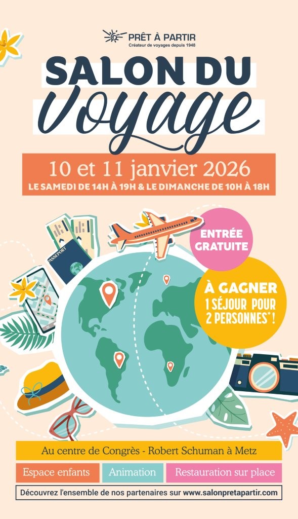 Lorraine Aéroport sera présent au Salon du voyage Prêt à Partir qui se tiendra au Centre des Congrès Robert Schuman à Metz les 10 et 11 janvier. L’occasion d’échanger avec nous et de découvrir nos vols.